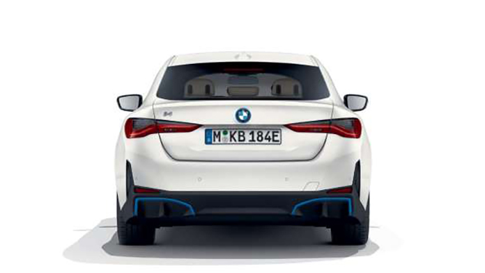Đuôi xe BMW i4 được thiết kế với các chi tiết khuếch tán khí động học, giúp tối ưu hóa luồng không khí và nâng cao hiệu suất vận hành. Đèn hậu LED hình chữ L kết hợp với cản sau sơn đen và các chi tiết dải sơn xanh tạo điểm nhấn. Viền logo BMW cũng được trang trí với màu xanh dương, một đặc trưng nhận diện của dòng xe điện BMW i.
